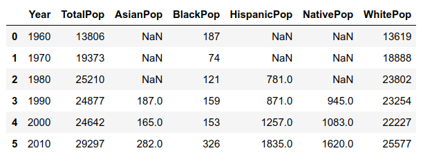 list_populations = ['TotalPop','BlackPop','WhitePop',\ 'AsianPop','HispanicPop','NativePop']#### I create an empty dataframe