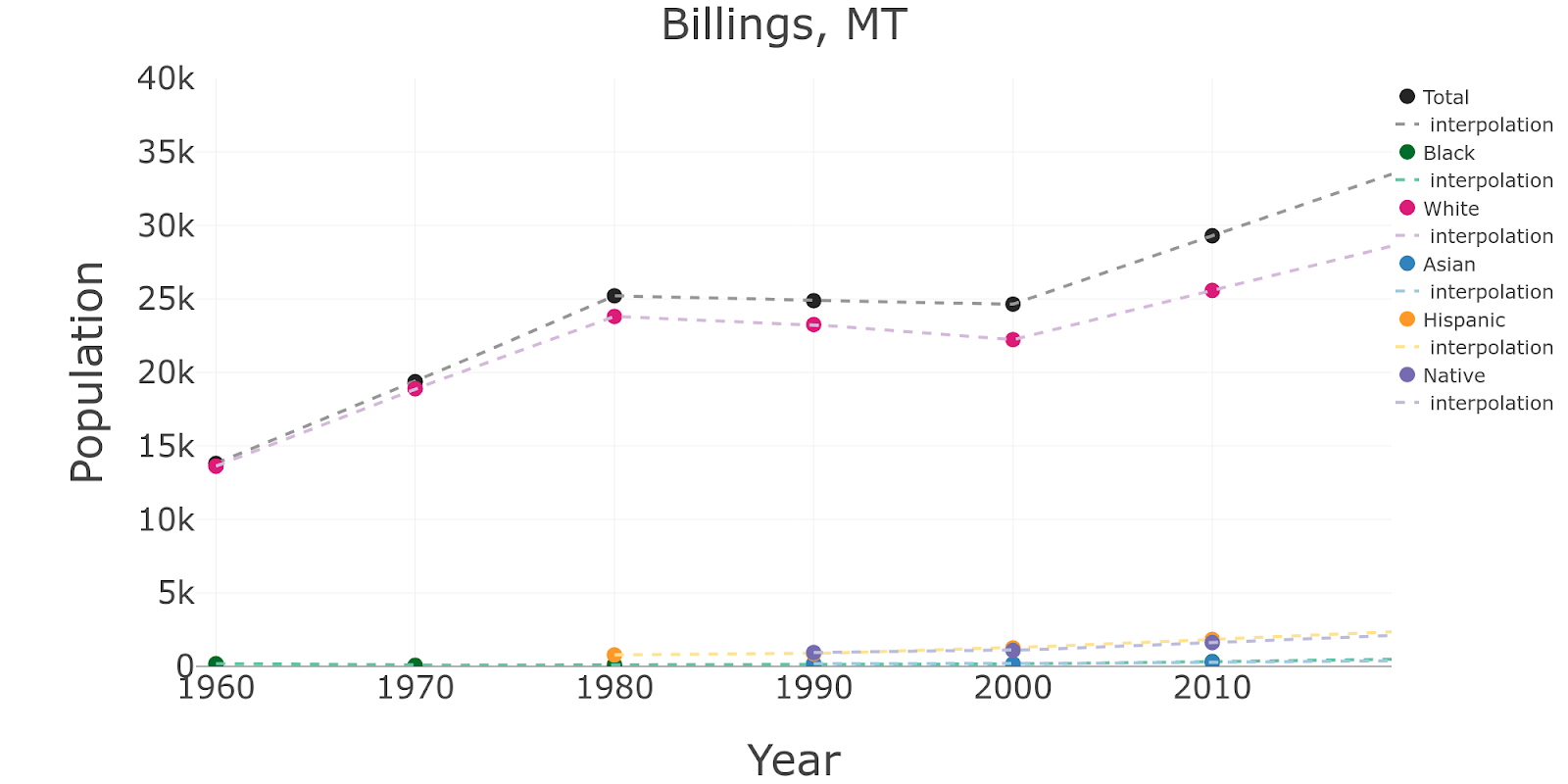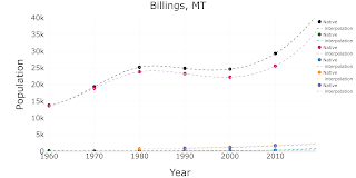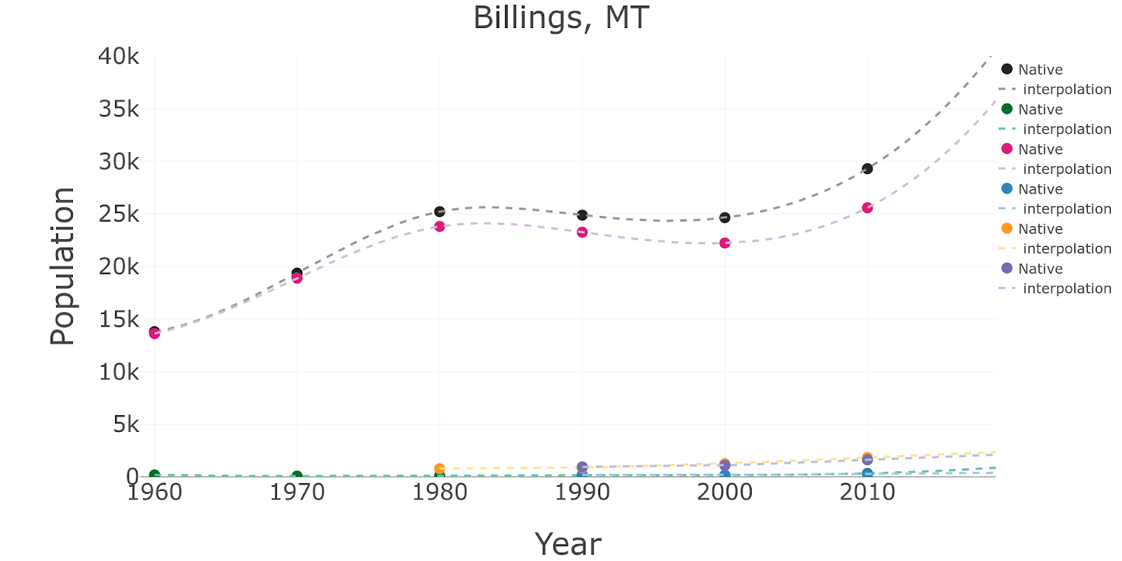 for population in list_populations: ### the actual data x = np.array(df_census_city[’Year’].tolist()) y = np.array(df_census_city[population].tolist()) ### the interpolation x_interpolate, y_interpolate = get_x_y_inter_extrapolation (df_census_city,\ ’Year’, population, kind_interpolation, flag_extrapolate) ############# traces for plotting: #### the actual data trace1 = go.Scatter( x = x, y = y, name = col_y.replace(’TotalPop’,“Total”).replace(“Pop”,”“), mode = ’markers’, marker=dict( color = list_colors[cont_colors], size = 20) ) data.append(trace1) ### the interpolated data trace2 = go.Scatter( x = x_interpolate, y = y_interpolate, name=’ interpolation’, mode = ’lines’, line = dict( color = (list_colors[cont_colors+1]), width = 4, dash = ’dash’) ) data.append(trace2) cont_colors +=2